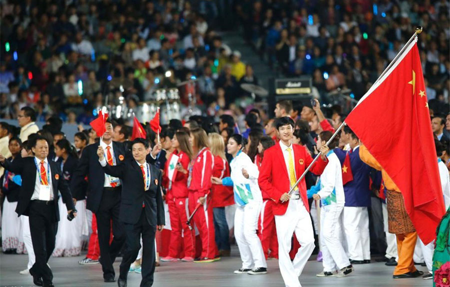 中國體育代表團第45個出場,旗手為擊劍運動員雷聲。2012年倫敦奧運會,雷聲獲得男子花劍冠軍,打破了中國男子花劍奧運金牌零的突破。而在2014年的仁川亞運會,身高1.93米的雷聲已經有過擔任旗手的經歷。歷史上中國代表團的旗手的運動員有易建聯、姚明、劉玉棟、宋立剛、宋濤、王立彬。