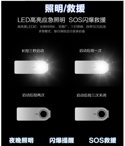 1、外出旅游時候提供照明。 在汽車應急啟動電源中,一般都會強大的LED照明系統,內部布置了強大的照明燈,不但可以為我們提供照明,還具備有爆閃、SOS急救燈、強光照明等功能,可以方便我們在夜間進行照明,應對各種緊急情況。如果我們需要使用LED照明功能,只需要長按開關鍵5秒啟動照明功能,然后再短按開關鍵切換照明狀態就可以了,其照明的狀態依次為:強光、爆閃、 SOS、關閉 。