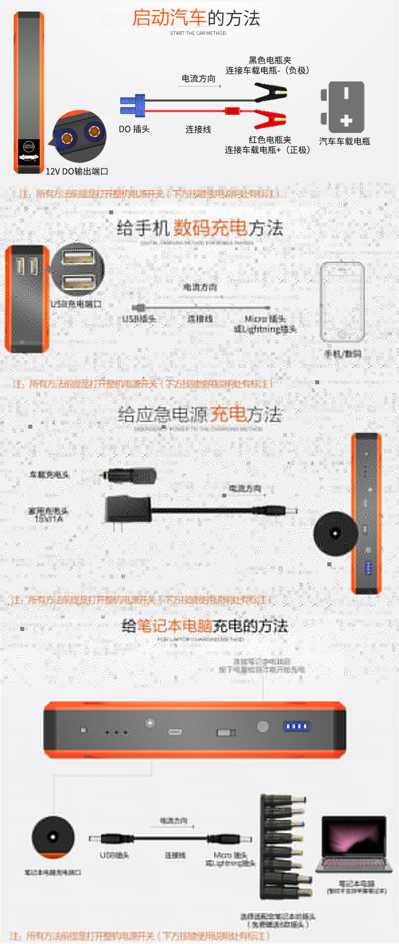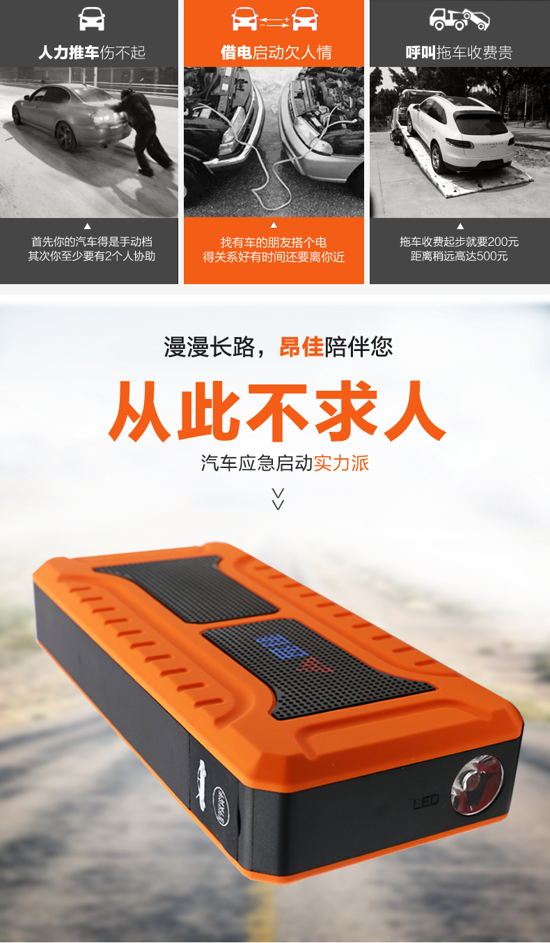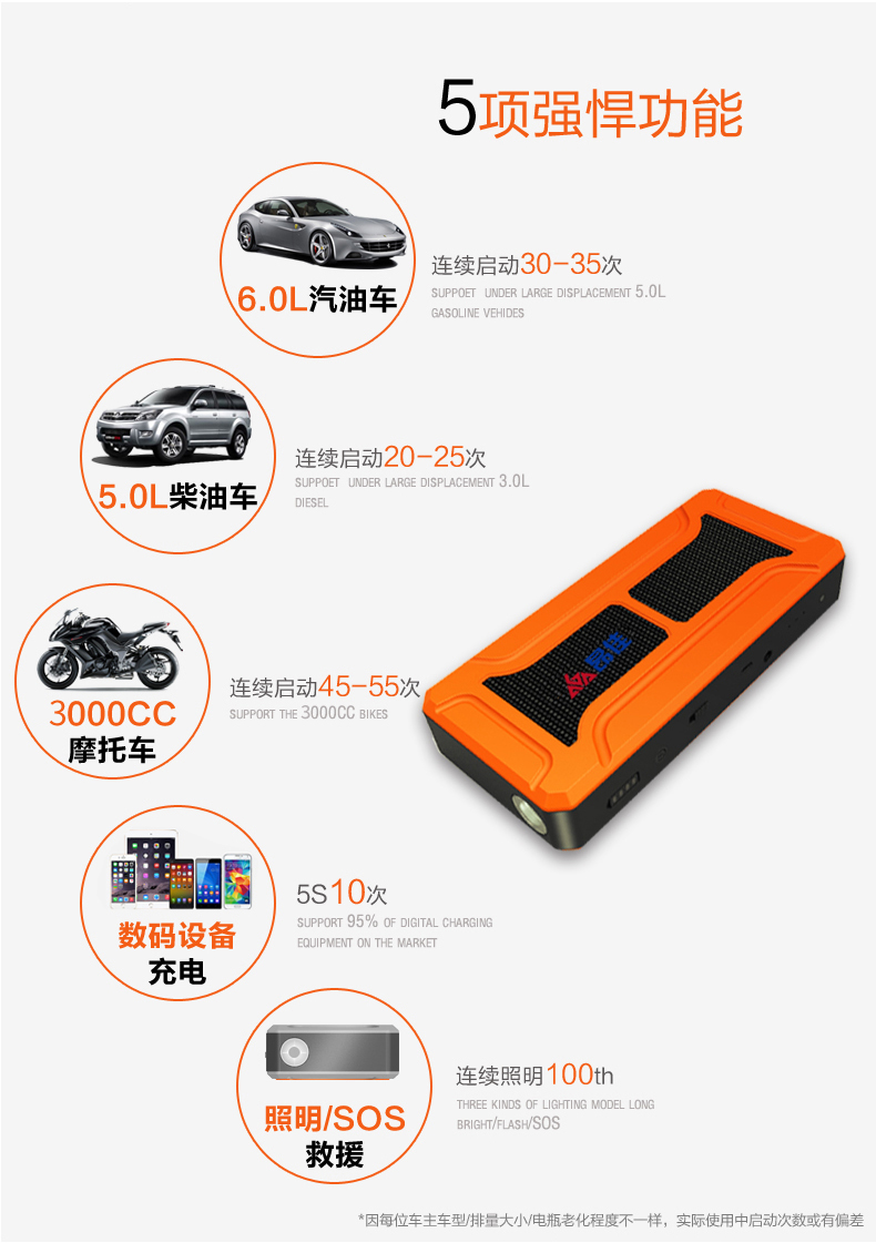 • 主要的功能:汽車應急啟動、LED燈(照明、爆閃、SOS)另可對車載電器、手機、平板電腦、MP4、數碼相機、PDA、掌上游戲機、學習機等產品充電